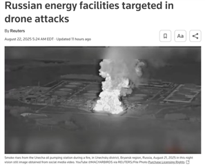 △路透社报道,俄罗斯是世界最大的能源生产国之一,乌克兰近期持续对俄罗斯的能源设施进行了无人机袭击。