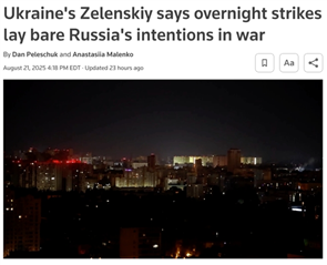 8月21日夜,俄军对乌克兰多地实施大规模空袭;乌方称,俄方动用了574架无人机和40枚导弹,乌克兰西部的美资企业伟创力(Flex)电子工厂受损,至少15人受伤。